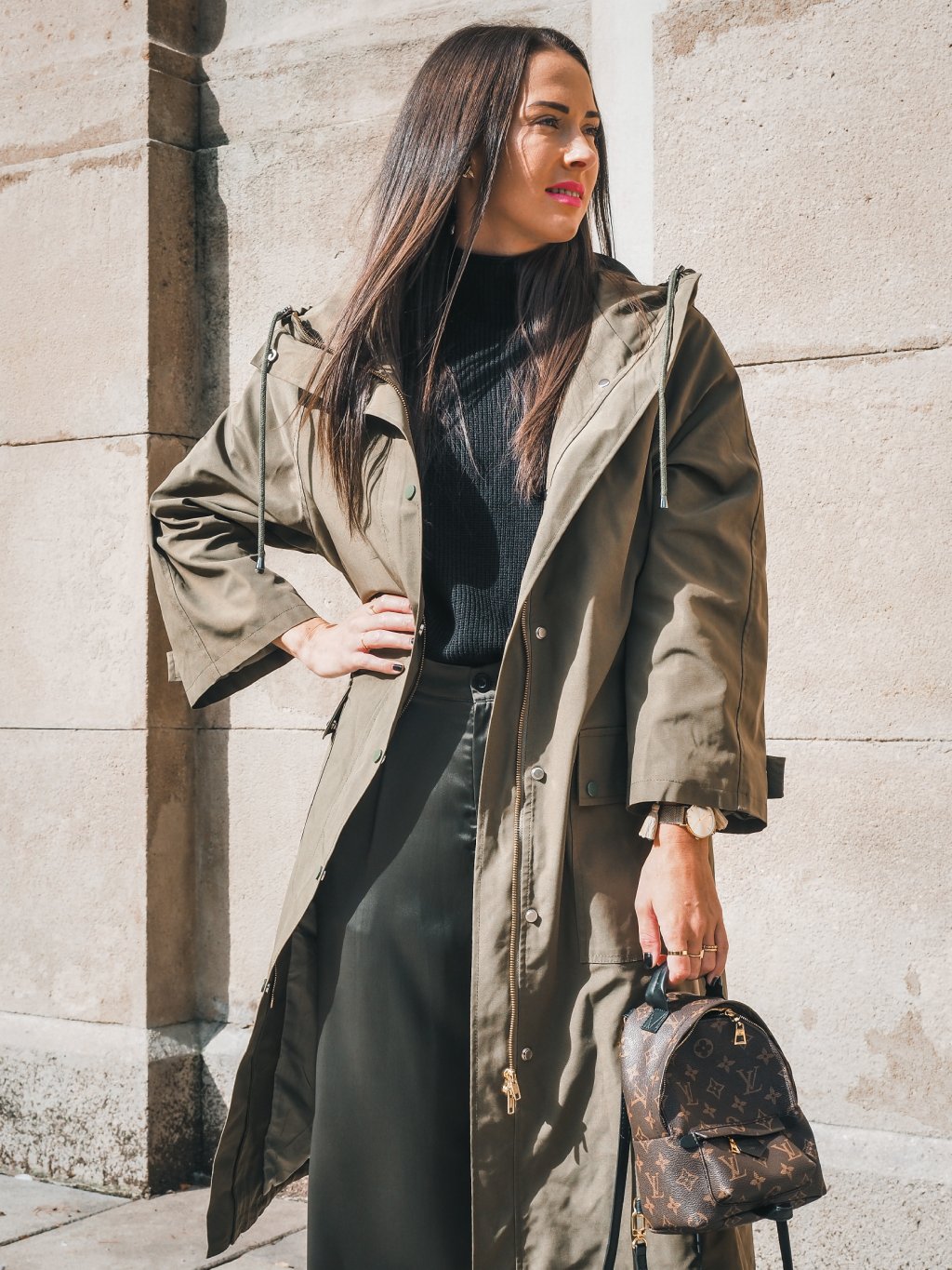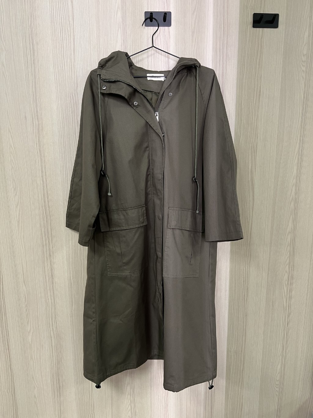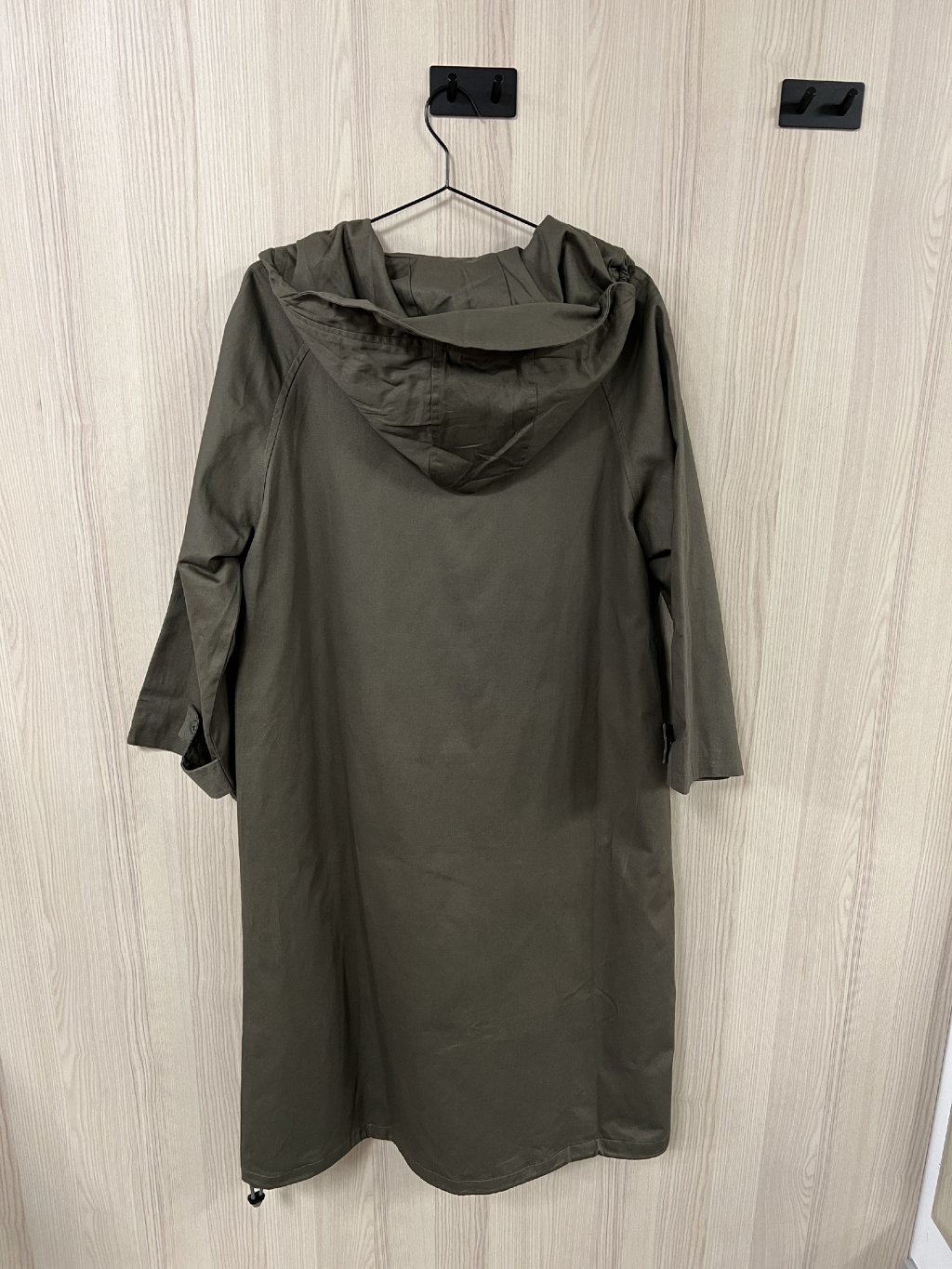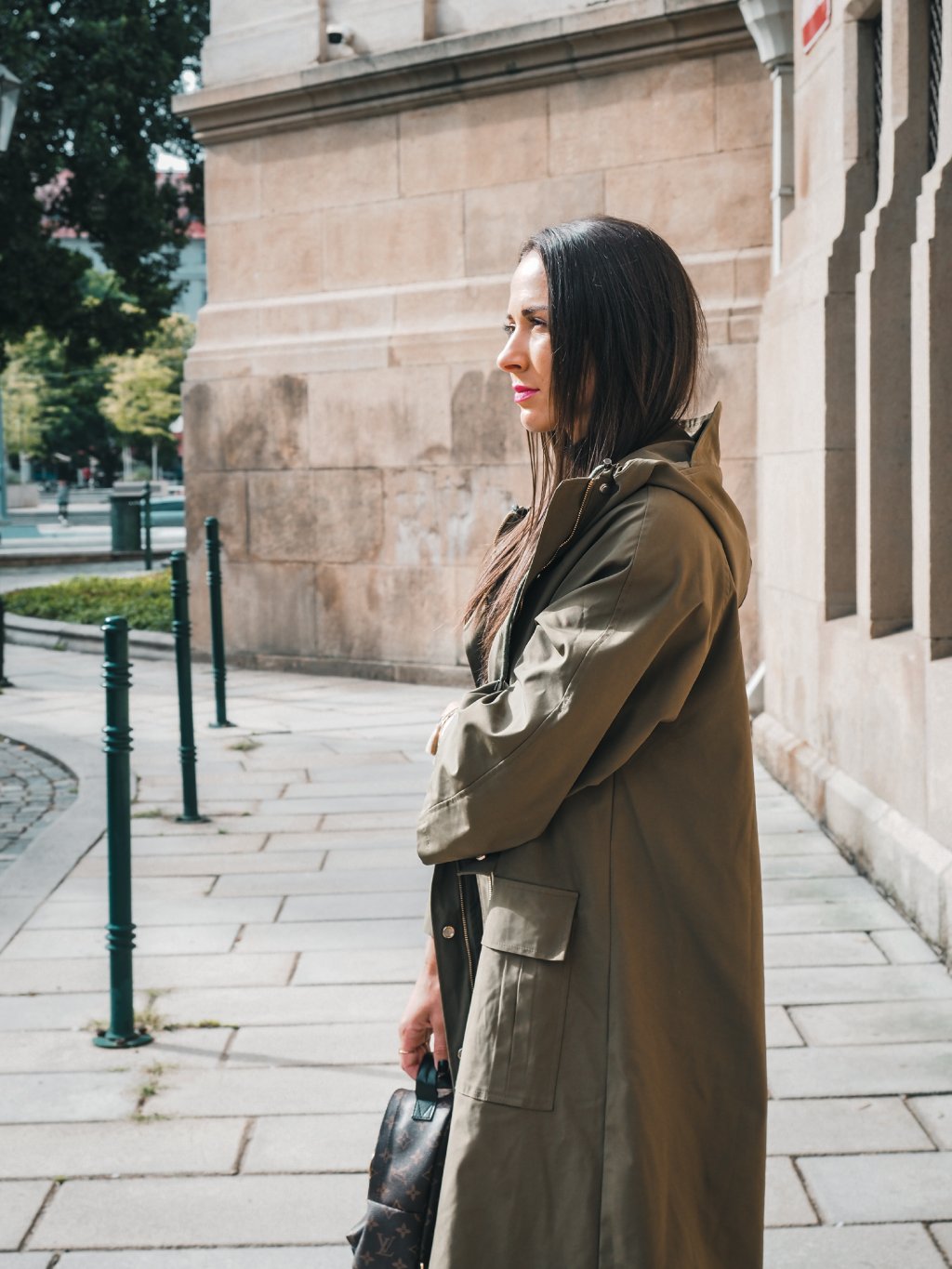 Dlouhý podzimní kabát s rozparkem v khaki barvě a lehkým oversize provedení.