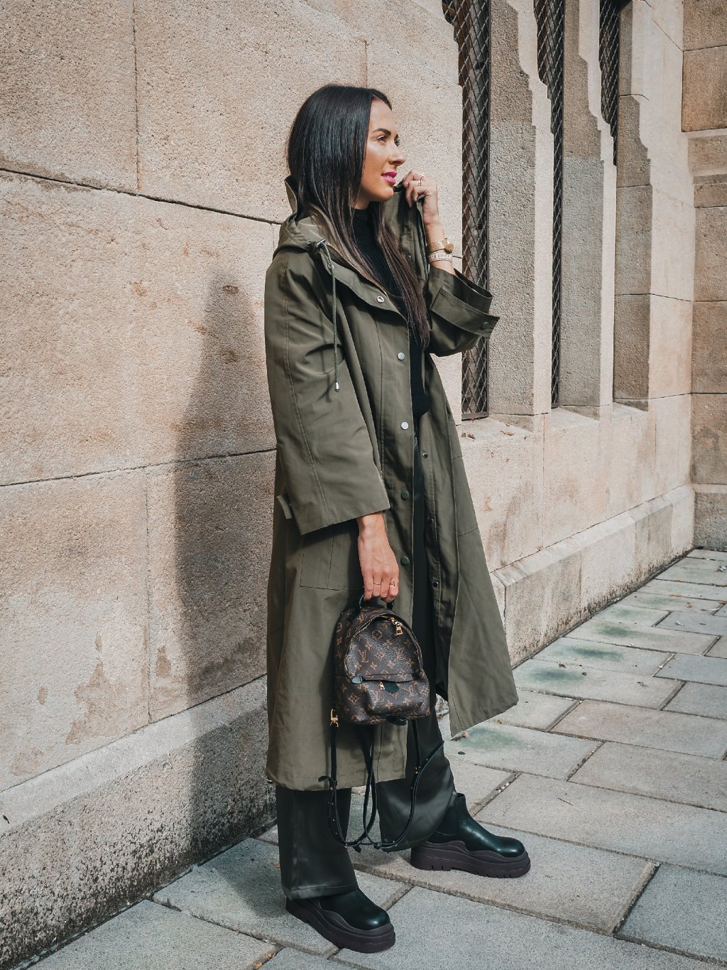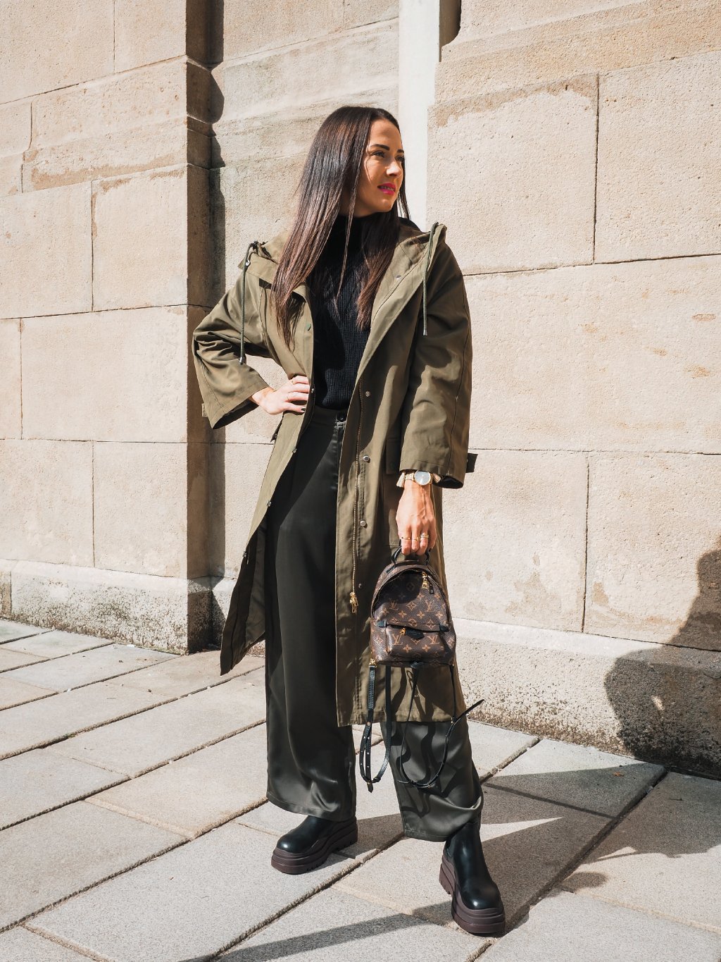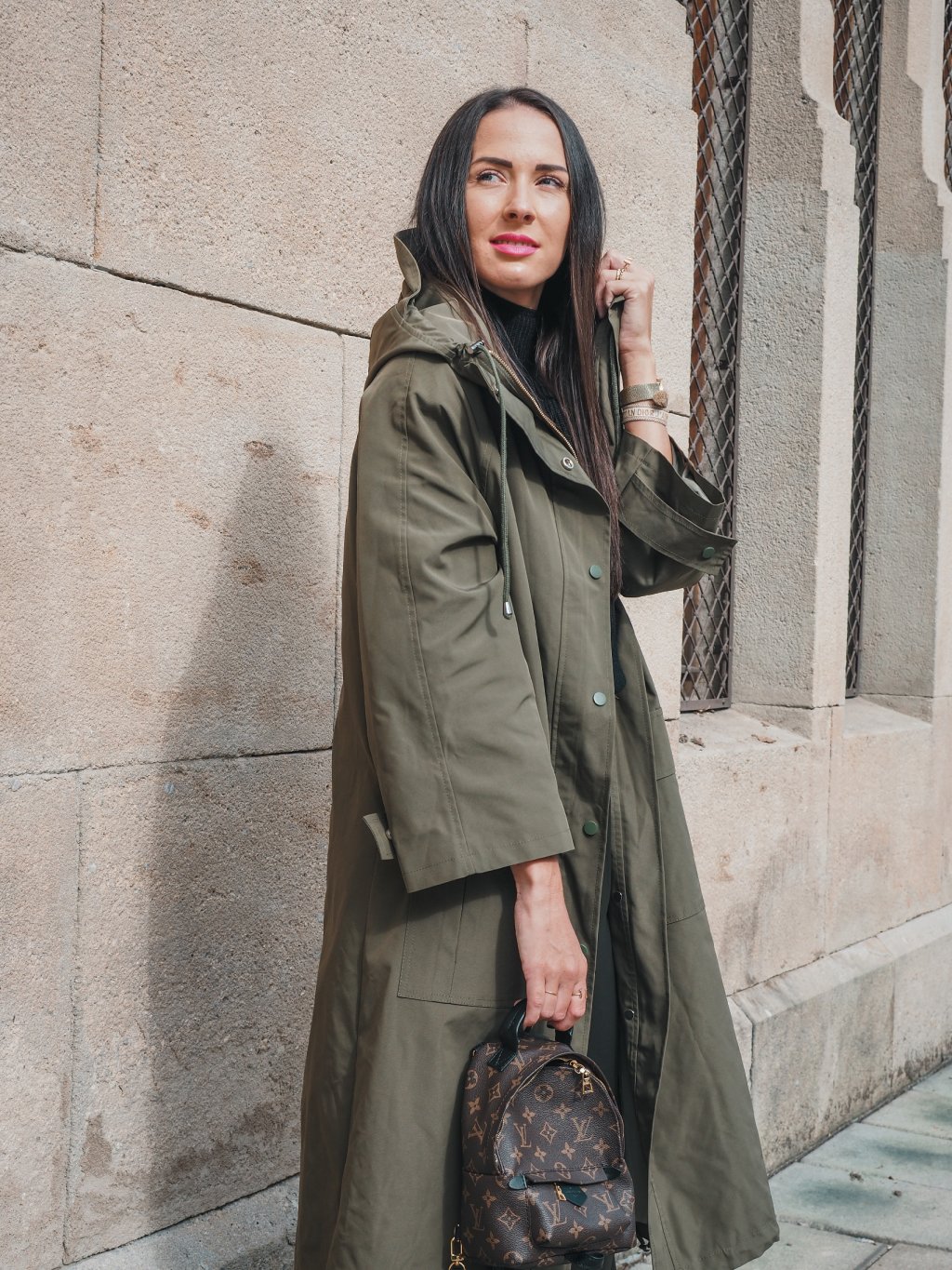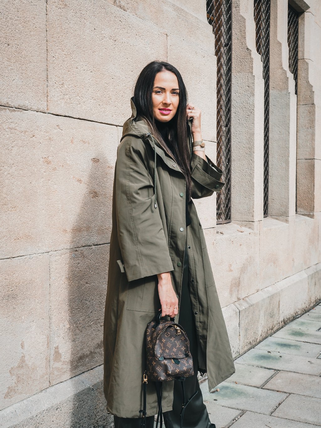 Dlouhý podzimní kabát s rozparkem v khaki barvě a lehkým oversize provedení.