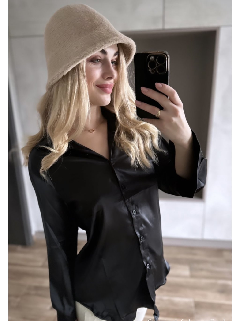 Dámský chlupatý klobouček v černé, béžové a světle béžové barvě.