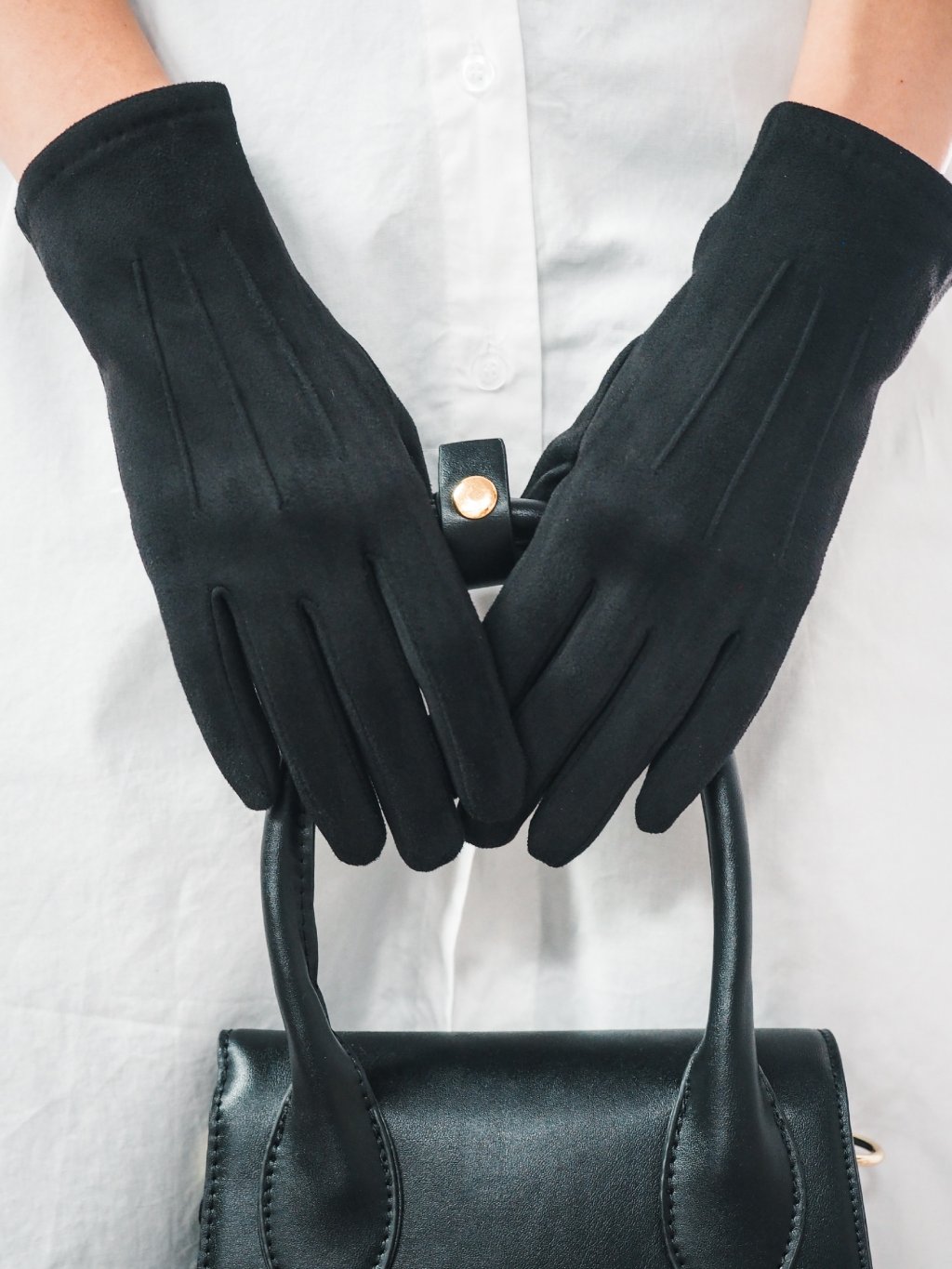 Elegantní prošívané rukavice v černé barvě, které jsou sametového vzhledu.