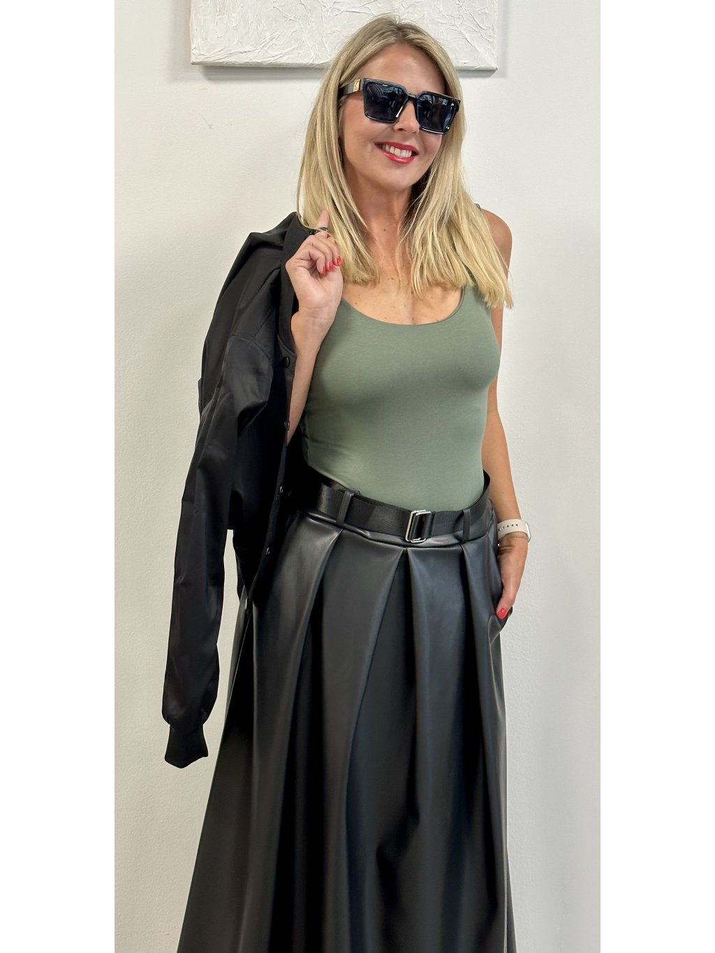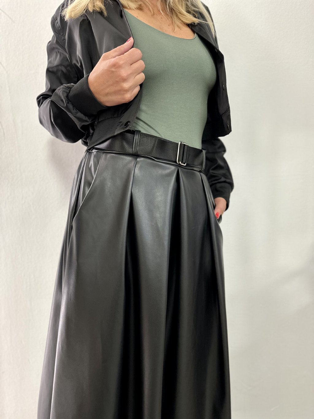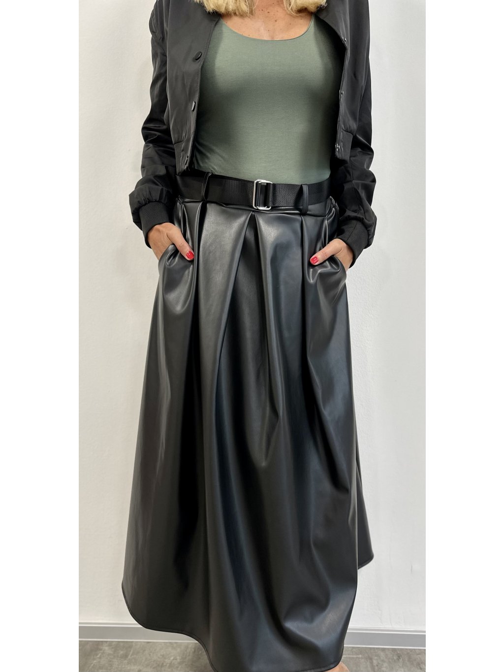 Dlouhá koženková sukně. S pružným pasem do gumy s ozdobným páskem.