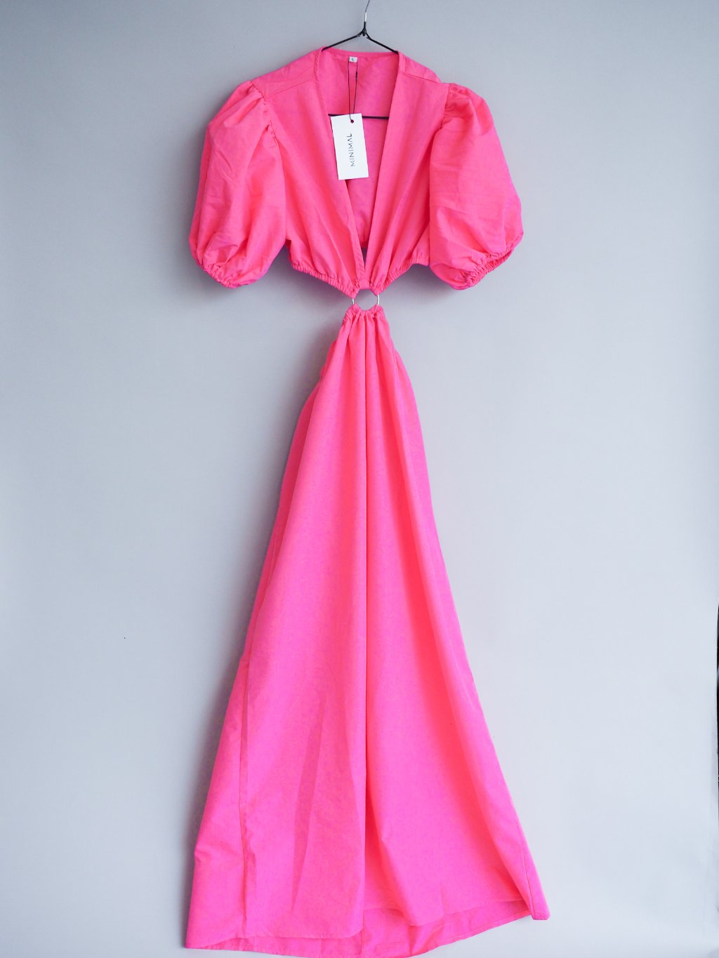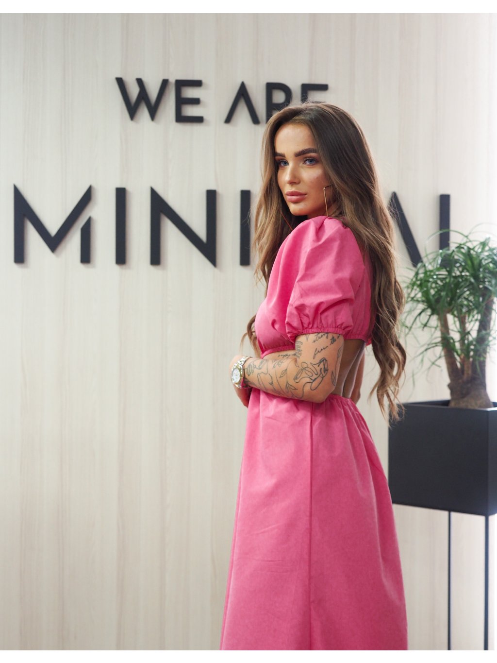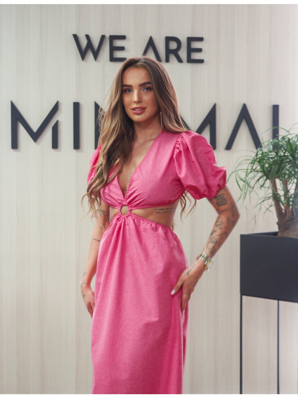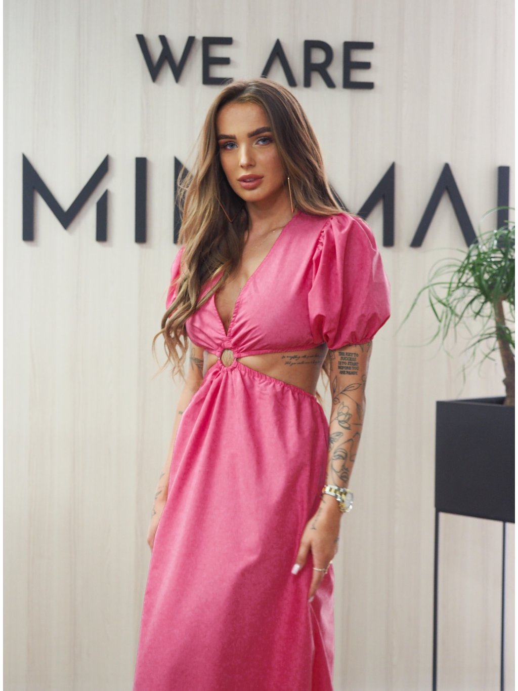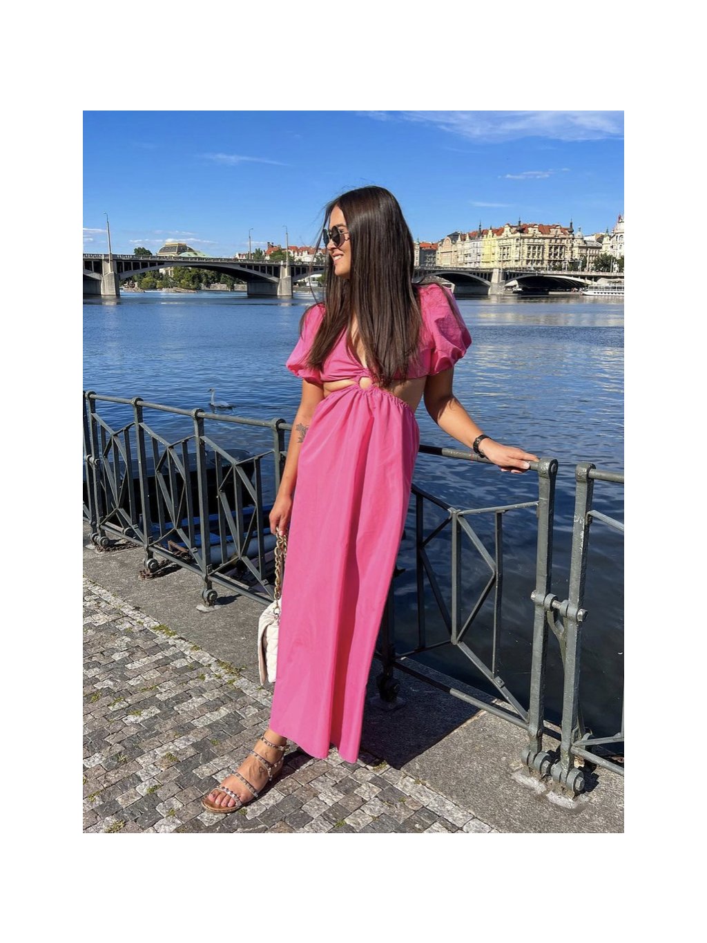 Trendy dlouhé, růžové šaty s rafinovaným střihem, holým pasem a výstřihem. Pas na gumu. Ideální na dovolenou, na večeři a nebo třeba do práce.