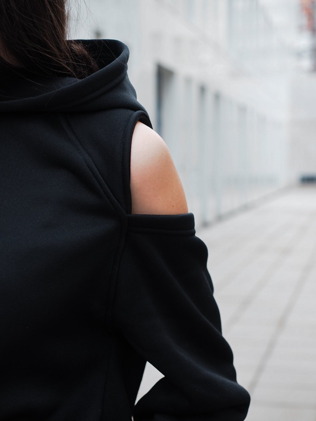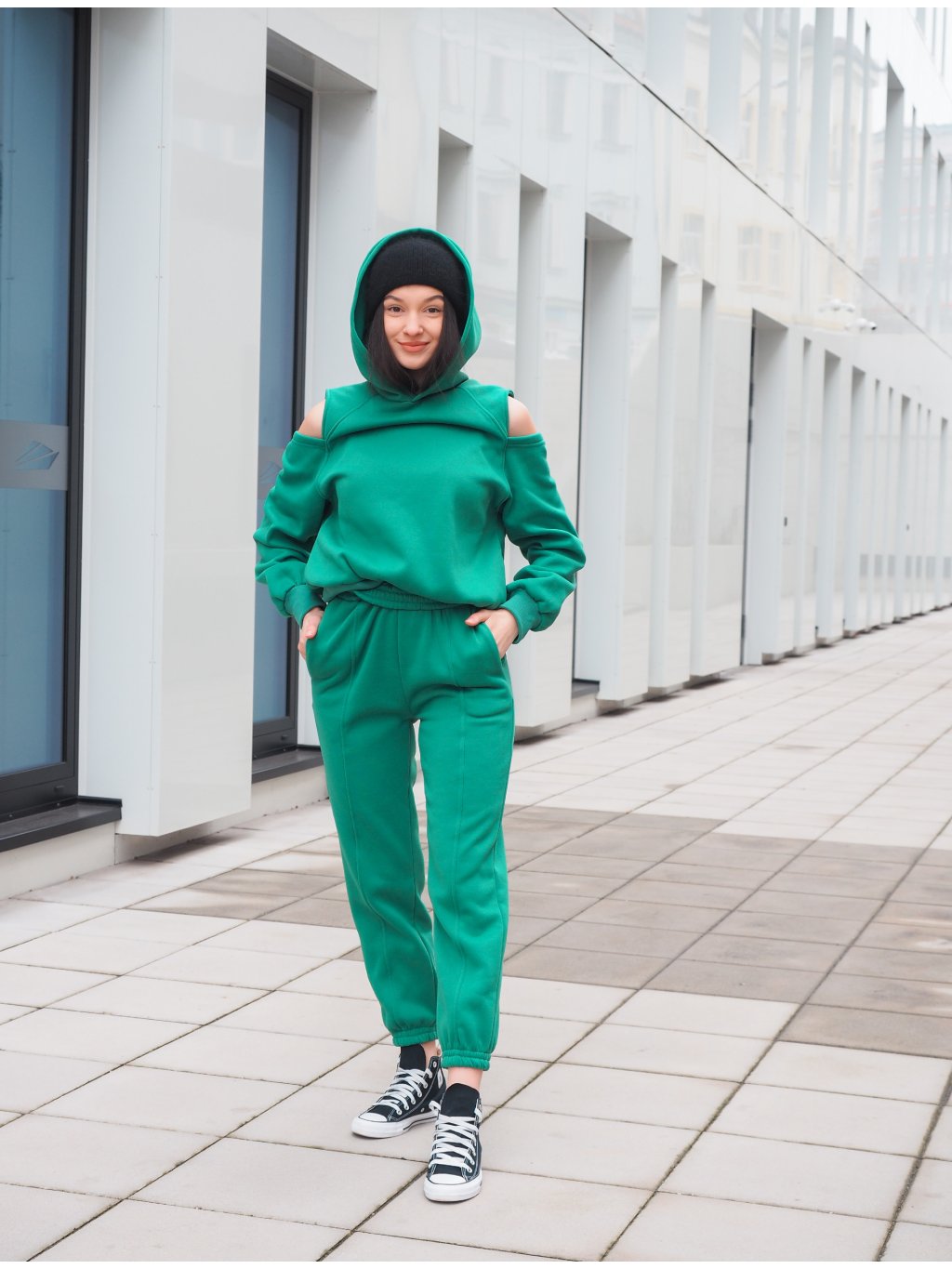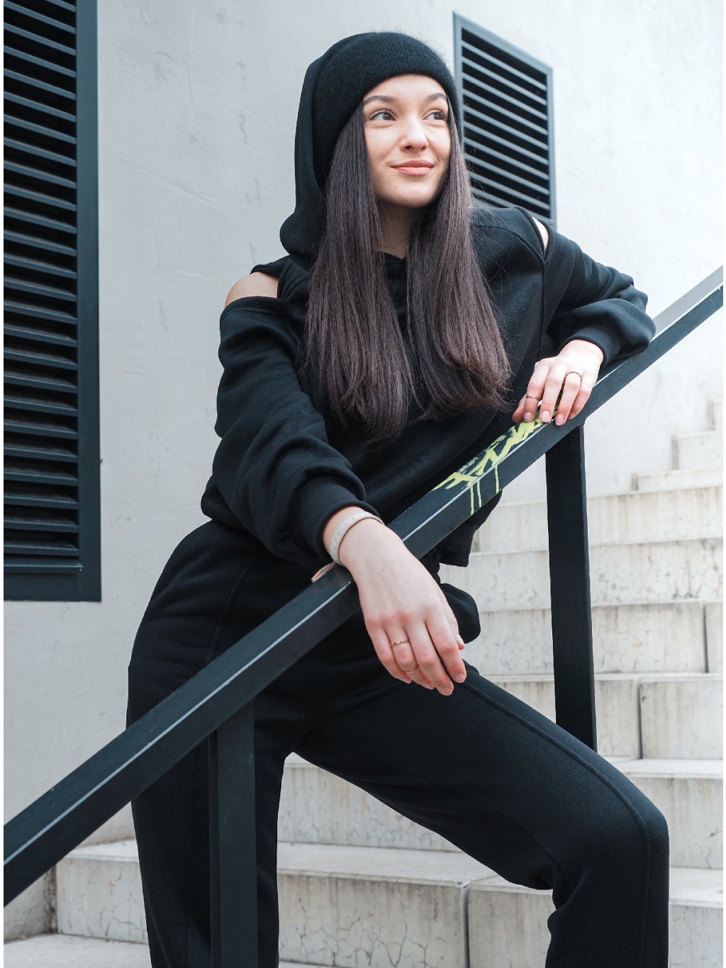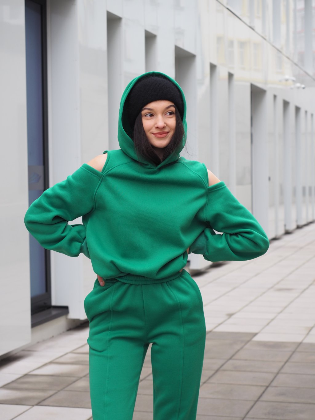 Dámská příjemná teplákovka s průstřihy na ramenou v černé a zelené barvě, ideální na jaro.