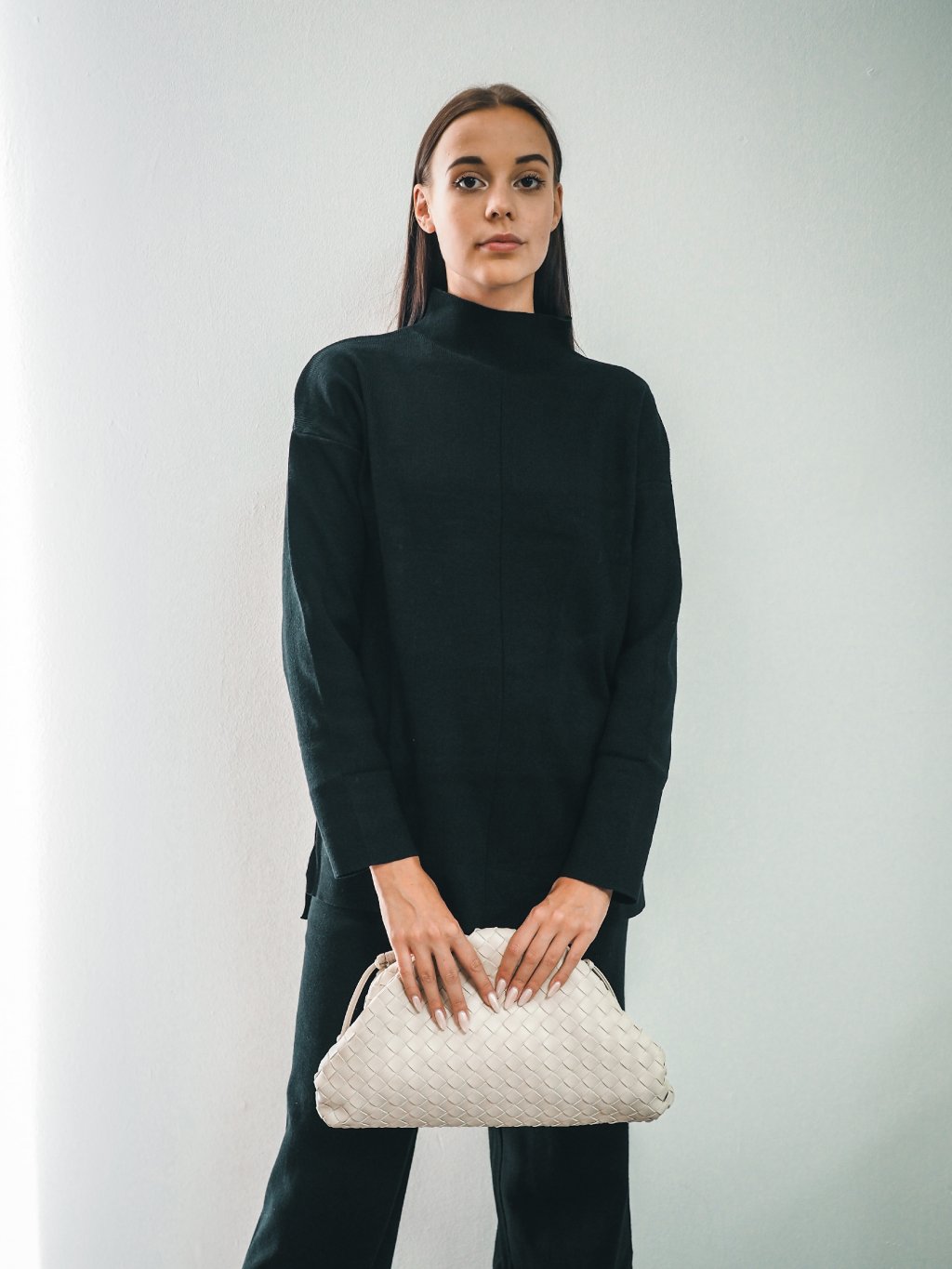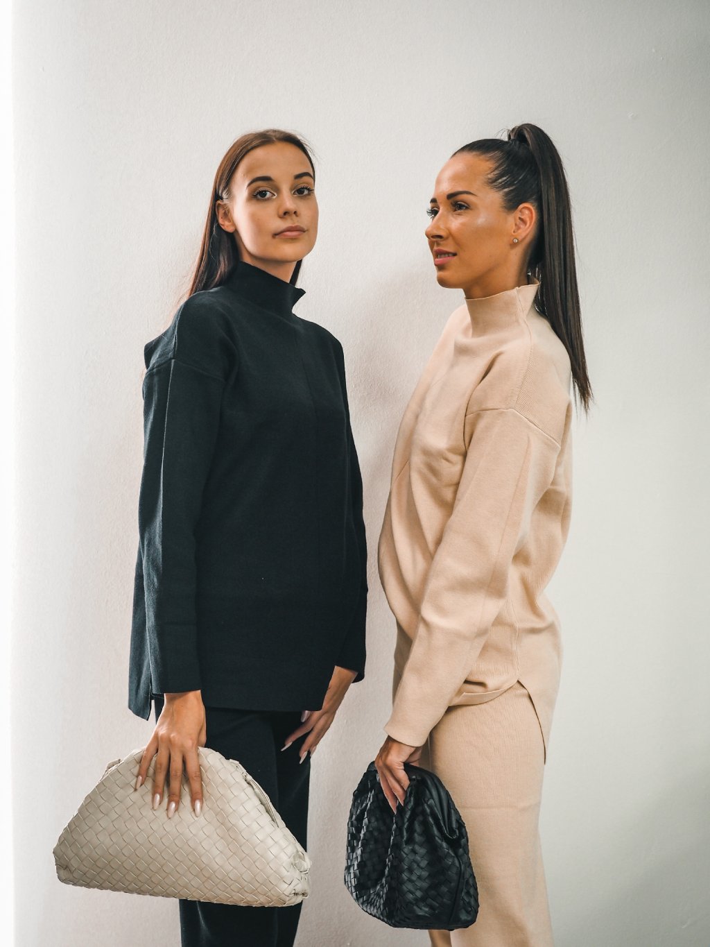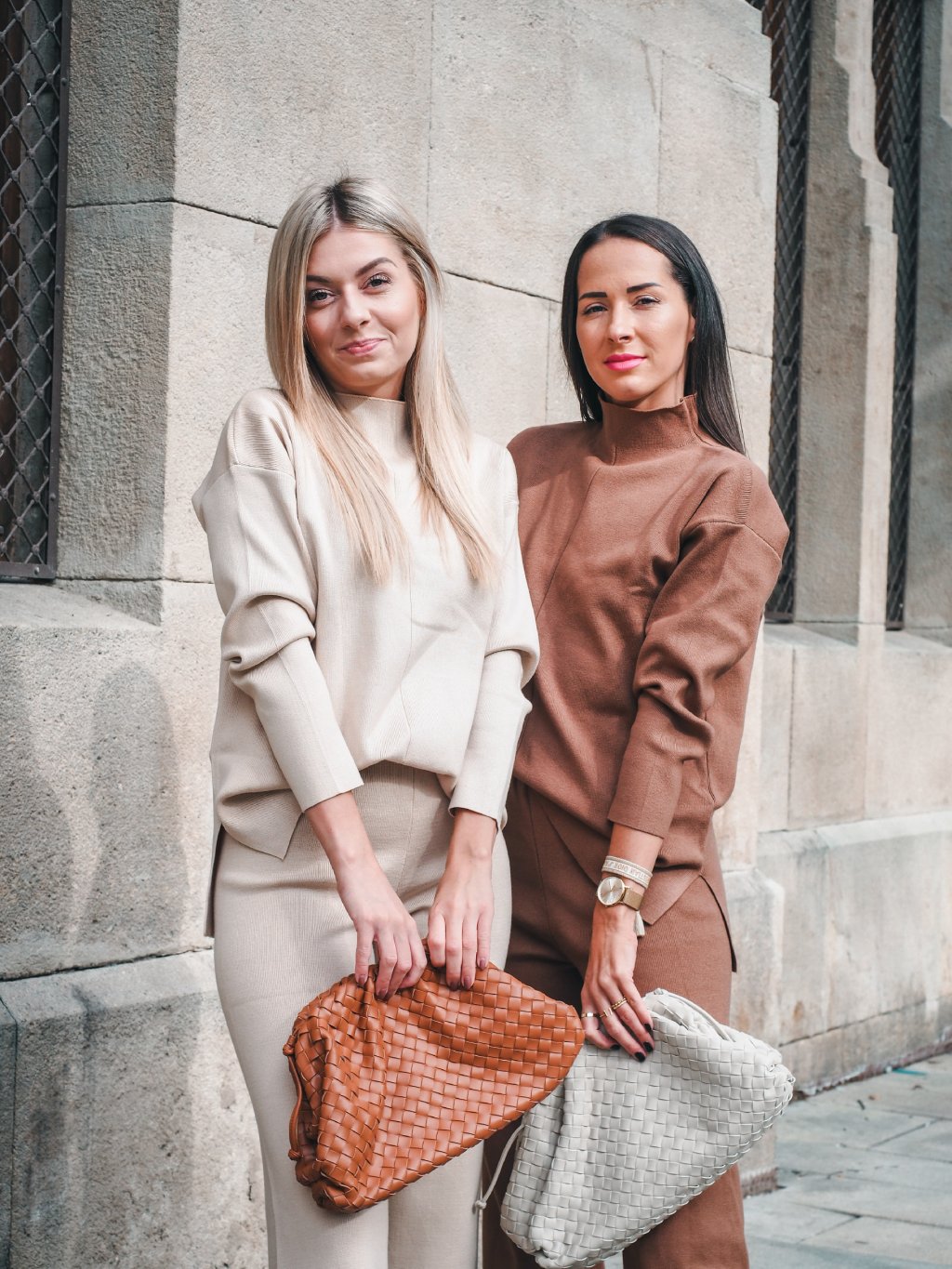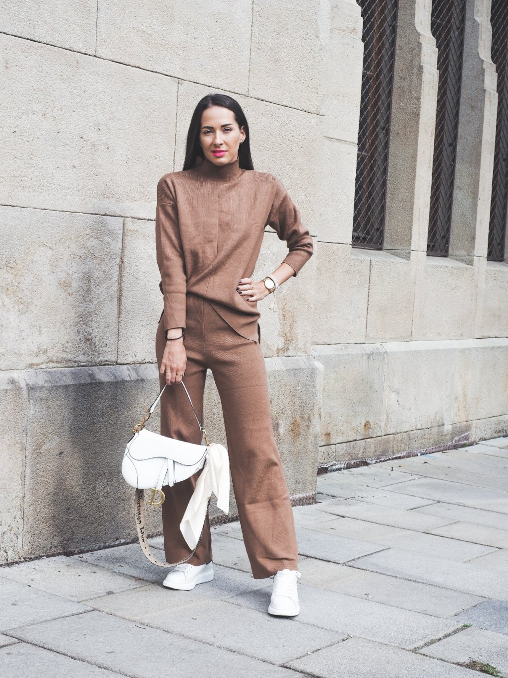 Úpletová teplákovka s rozšířenými kalhoty a svetrem v béžové, černé a hnědé barvě.