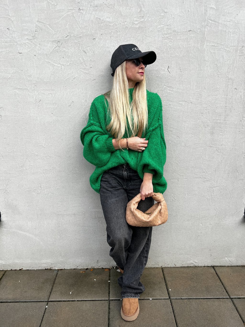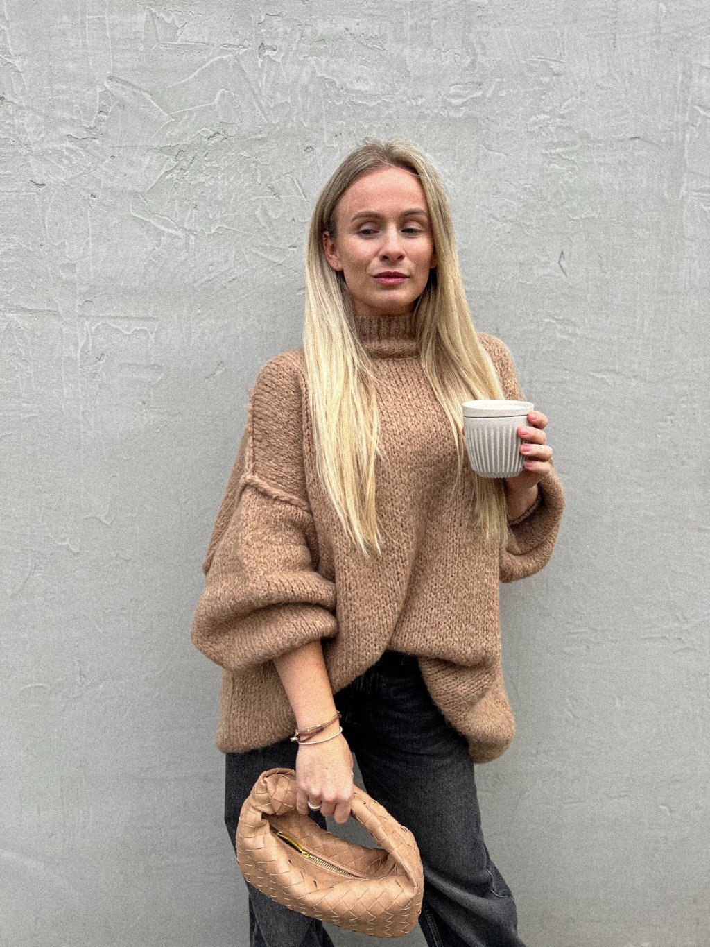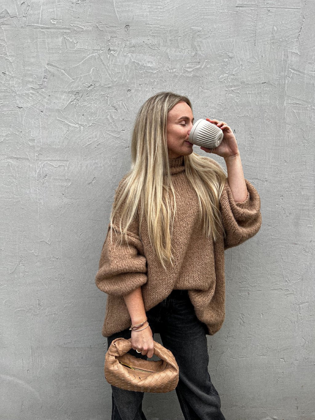 Má kulatý výstřih s žebrovaným lemem, silně spuštěná ramena a dlouhé, široké rukávy