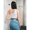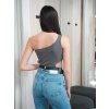 Dámský top na jedno rameno s průstřihy v černé, bílé, šedé a hnědé barvě.