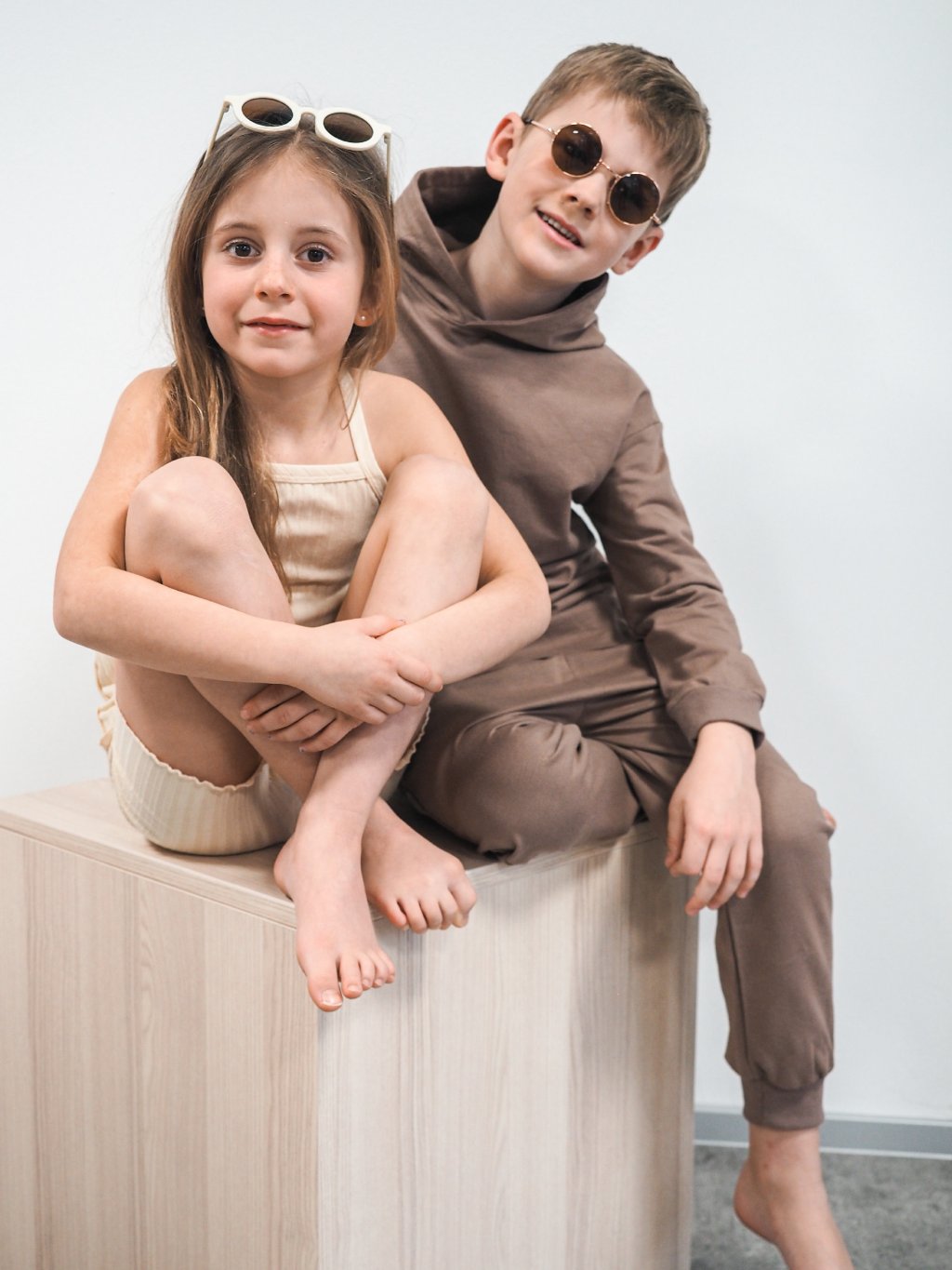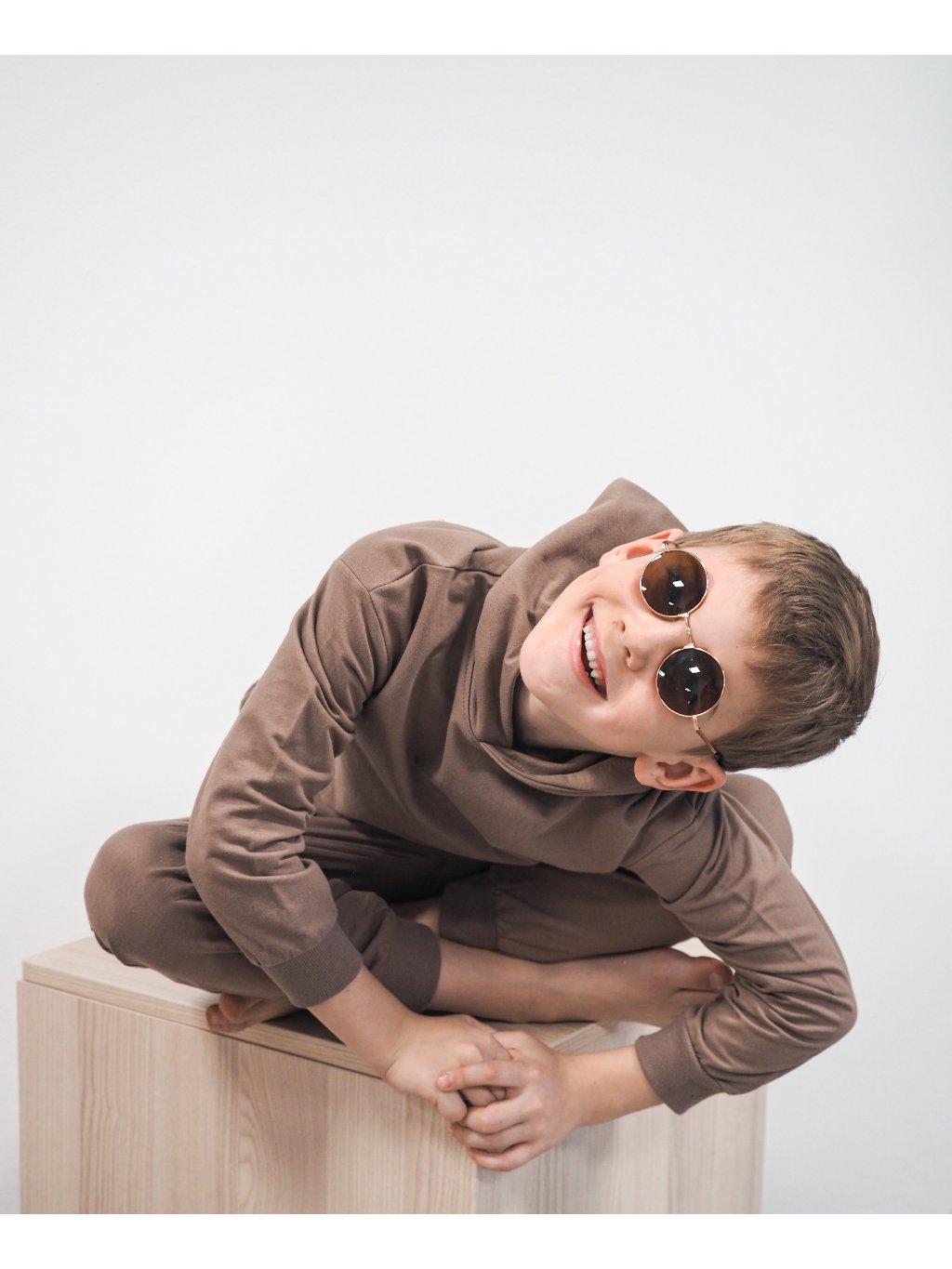 Dětské sluneční brýle v rosegold barvě a kulatém tvaru.